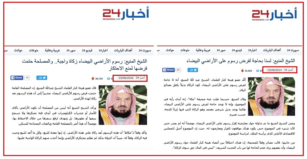 وفي حين كان المنيع اكد العام الماضي في فتواه الشهيرة حول عدم شرعية فرض الرسوم الضريبية على الاراضي البيضاء بسبب وجود بديل شرعي معتمد وهو الزكاة التي فيها براءة للذمة حسب قولة، فقد أكد في اصداره الجديد للفتوى ذاتها قبل أيام والتي جاءت بعد خطة بن سلمان للاصلاح الاقتصادي أن الرسوم الضريبية التي أعلنت الدولة السعودية مؤخرا فرضها على الاراضي البيضاء “تعد زكاة على هذه الارض” .