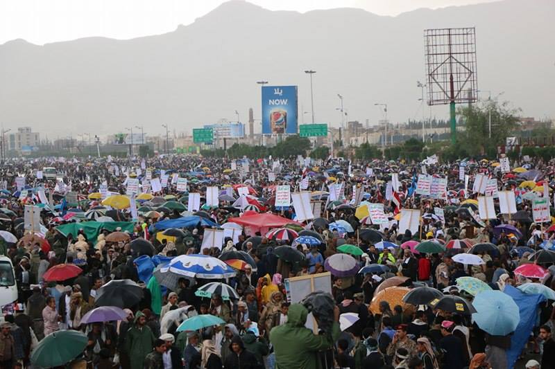 اكد المشاركون في التظاهرون التي شهدت تساقطا غزيرا للغيث وسبول اعاقت وصول الآلاف إلى ميدان السبعين، مباركتهم وتأييدهم المطلق للاتفاق السياسي الموقع بين القوى السياسية المناهضة للعدوان ممثلة بالمؤتمر الشعبي العام وحلفائه وأنصارالله وحلفائهم داعين بقية الأحزاب السياسية المناهضة للعدوان للانضمام والتوقيع على هذا الاتفاق، وتأجيل الخلافات البينية بهدف التصدي للعدوان.