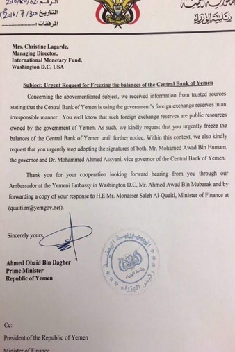 وكانت مصادر حكومية مالية سخرت من مذكرة احمد عبيد بن دغر الموجهة الى صندوق النقد الدولي ومطالبته بتجميد حسابات البنك المركزي اليمني في الخارج وعدم اعتماد توقيع محافظ البنك محمد عوض بن هُمام.