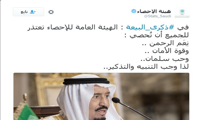 في مؤشر على تصاعد حال الاحتقان في الداخل السعودي على نظام سلمان بن عبد العزيز ونجله المراهق اشعلت تغريدة لهيئة الاحصاء السعودية على موقعها بموقع التواصل الاجتماعي “تويتر” فورة انتقادات ساخرة من مغردين سعوديين بعدما طالبت المواطنين السعوديين الاحتفال بذكرى البيعة بإحصاء ما سمته ” نعم الرحمن وقوة الإيمان وحب سلمان”.