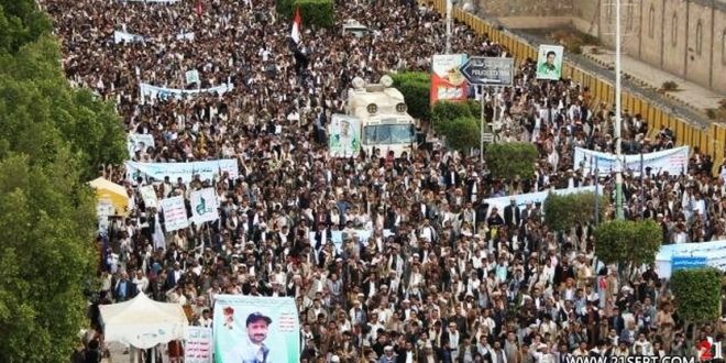 احتشد عشرات الآلاف من اليمنيين عصر اليوم في ساحة باب اليمن وشارع الزبيري وسط العاصمة صنعاء في تظاهرة جماهيرية حاشدة للتنديد بمجازر العدوان السعودي الغاشم واعلان الوفاء للشهداء، استجابة لدعوة اللجنة الثورية العليا للمشاركة في التظاهرة التي نظمت تحت شعار ” وفاء لدماء الشهداء”.