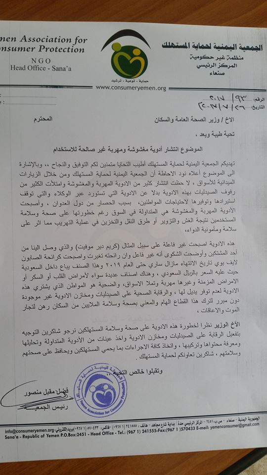 وذكرت الجمعية اليمنية لحماية المستهلك، ان هناك اصناف عديدة سواء لأمراض القلب أو السكر أو الامراض المزمنة وغيرها مهربة وتملا الاسواق، والضحية هو المواطن الذي يشتري هذه الادوية لعدم توفر بديل لها ، والرقابة الصحية على الصيدليات ومخازن الادوية غير موجودة دون مبرر لترك هذا القطاع الهام والمعني بصحة وسلامة الملايين من السكان رهن لتجار الموت والاعاقات.