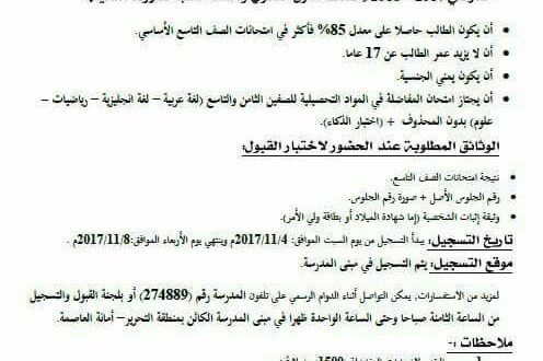 1- أن يكون الطالب حاصلا على معدل 85% فأكثر في امتحانات الصف التاسع الأساسي.