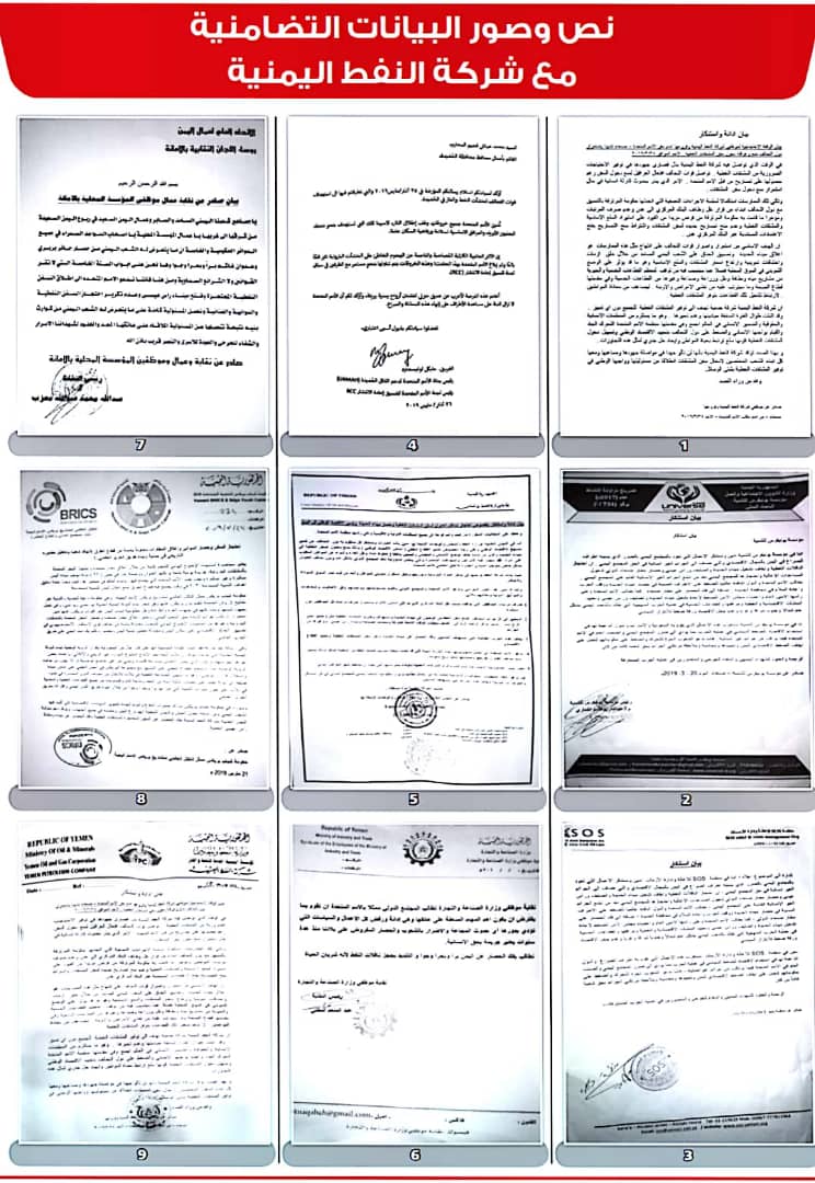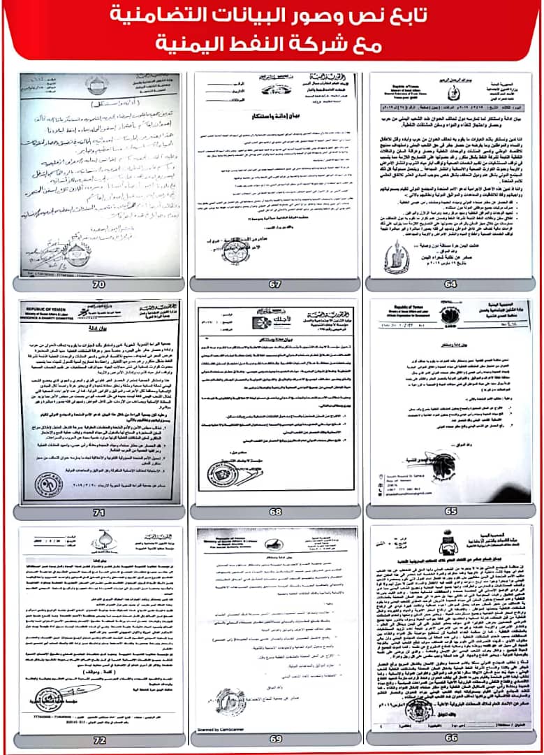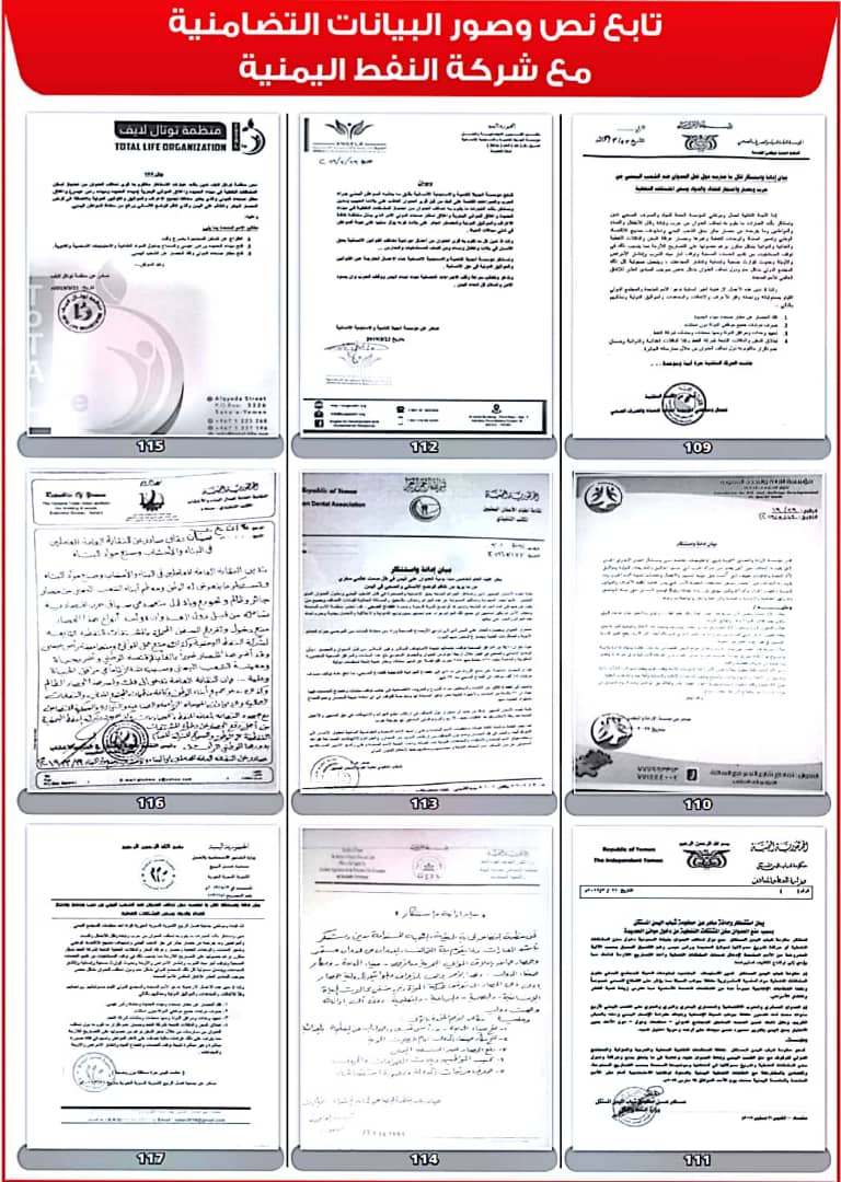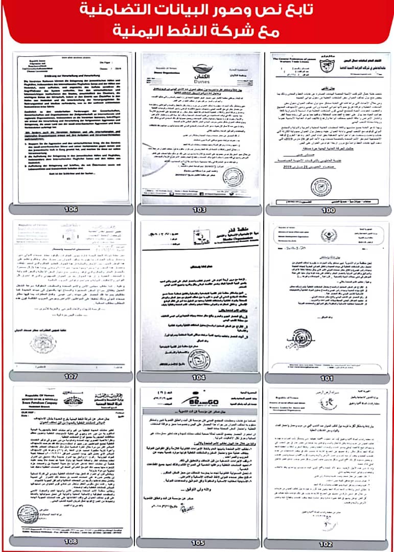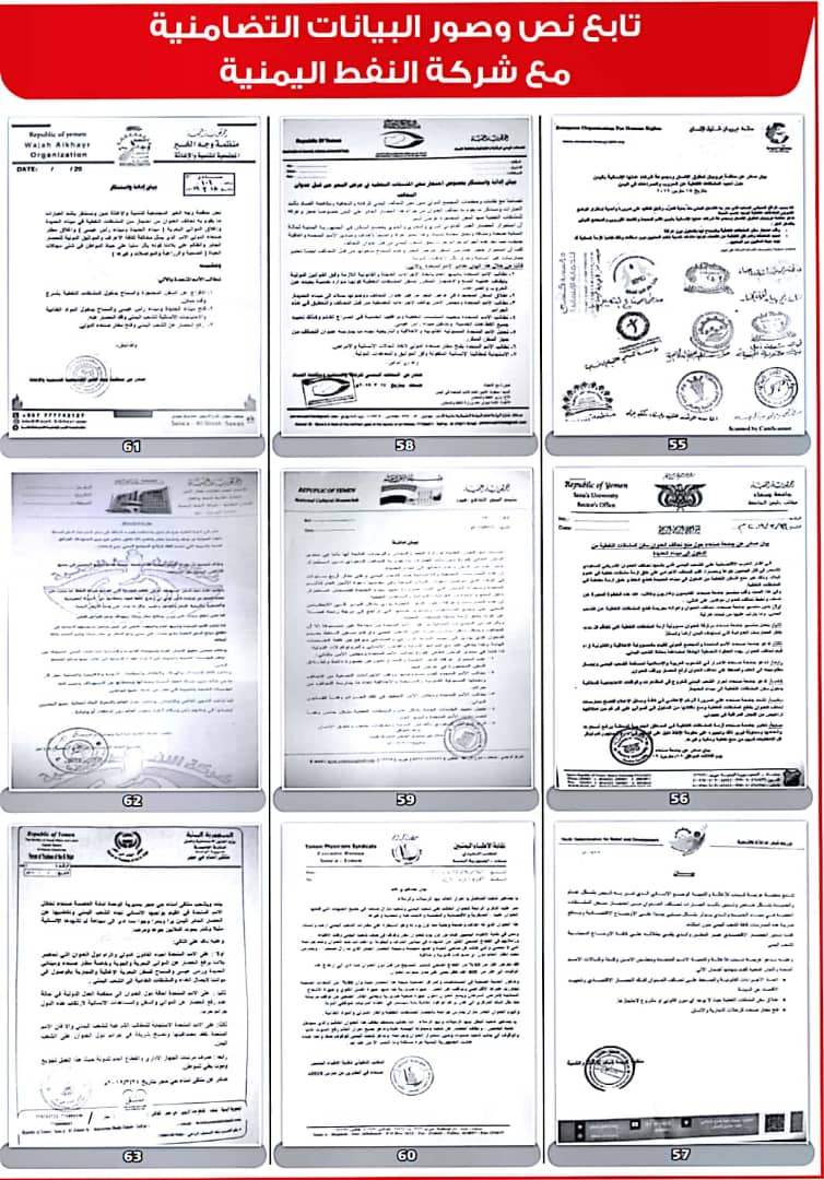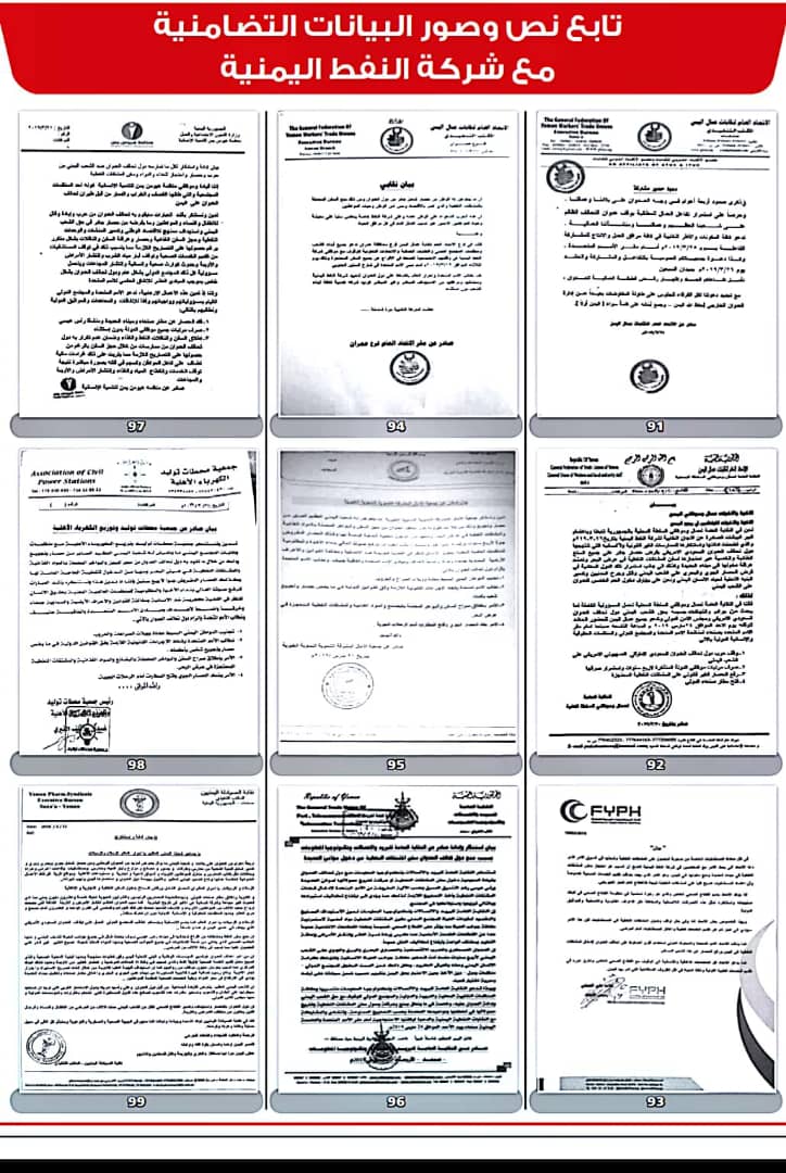 وأصدرت 208 منظمات ونقابات عمالية ومهنية بيانات، أعلنت فيها تضامنها مع شركة النفط اليمنية ضد ما وصفتها بـ”الإجراءات التعسفية التي تمارسها قوى التحالف والحصار لمنع وصول البواخر المحملة بالمشتقات النفطية إلى ميناء الحديدة”.